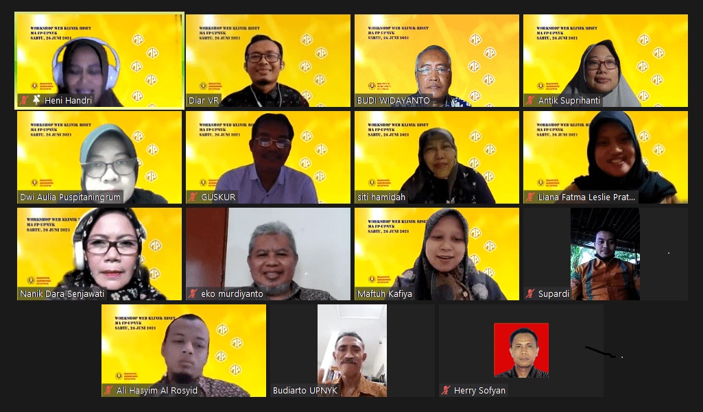 Dalam rangka efisiensi dan efektifitas penyelesaikan studi PS MA UPNYK dengan mengadaptasi kebutuhan para peserta, PS MA UPNVY mengadakan WORKSHOP KLINIK RISET yang dilaksanakan pada hari Sabtu, 26 Juni 2021 dimulai pada pukul 12.30 WIB. Acara menghadirkan Dr. Diar Veni Rahayu, pakar matematika yang membahas proses pembimbingan penelitian berbasis WEB. Hadir dalam acara tersebut, Dekan dan Wakil Dekan 1 Fakultas Pertanian UPNYK, Heri Sofyan, ST., MT. (pakar IT), tim Penelitian Kelembagaan (Dr. Budi Widayanto, Dr. Nanik Dara S., Heni Handri U, SP., MM, dan Maftuh Kafiyah, S.TP., M.Sc.), dan admisi PS MA UPNYK (Supardi, SE dan Agus Kurniawan).