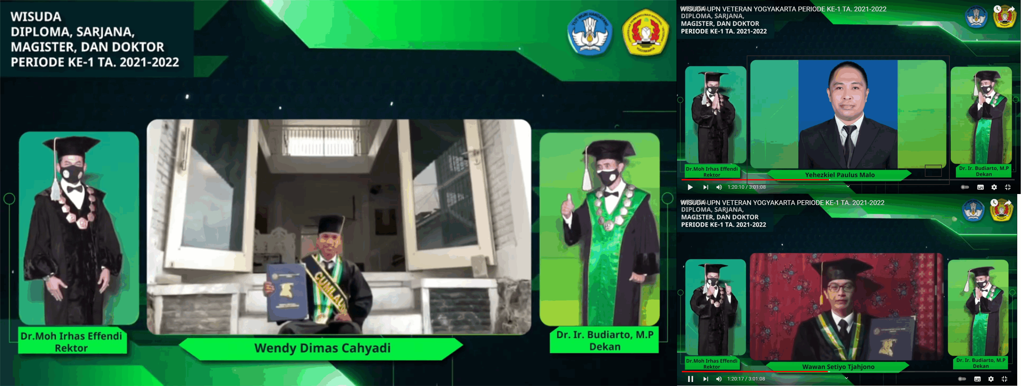 UPN Veteran Yogyakarta melaksanakan Acara Wisuda Program Diploma III, Sarjana, Magister, dan Doktor periode I 2021/2022. Acara Wisuda dibuka dengan menyanyikan lagu Indonesia Raya, Mars Bela Negara dan Mengheningkan Cipta yang diimpin oleh Ketua Senat Prof. Dr. Sutanto, sekaligus membuka Acara Wisuda.