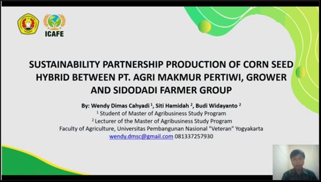 Dalam rangka The 1st International Conference on AGRICULTURAL, FOOD, and ENVIRONMENT, dengan tema “Promoting Technological Innovations in Agricultural and Food Industry for Sustainable Development, mahasiswa Magister Agribisnis FP-UPNYK menyampaikan makalahnya dengan judul Sustainability Partnership Production of Corn Seed Hybrid between PT Agri Makmur Pertiwi, Grower, and Sidodadi Farmer Group. Makalah yang disampaikan pada intinya adalah Sebuah kelompok membutuhkan seorang pemimpin handal yang akan membawa keberhasilan dan keberlangsungan  kelompoknya. Untuk kemajuan kelompoknya, seorang pemimpin dituntut dapat menjalin kemitraan  dengan  berbagai pihak. Hasil penelitian menunjukkan bahwa peran pemimpin kelompok tani sangat menentukan keberhasilan dan keberlangsungan program. Keberhasilan dan keberlangsungan pimpinan dapat dilihat dari reputasi seorang pemimpin yang memiliki kemampuan untuk melakukan pendekatan pada pemangku kepentingan. Pemimpin pada kelompok memiliki kredibilitas, terpercaya, keterhandalan, dan tanggung jawab. Makalah disampaikan oleh Wendy Dimas Cahyadi, Siti Hamidah, dan Budi Widayanto. (budiwe_25/11/2021).